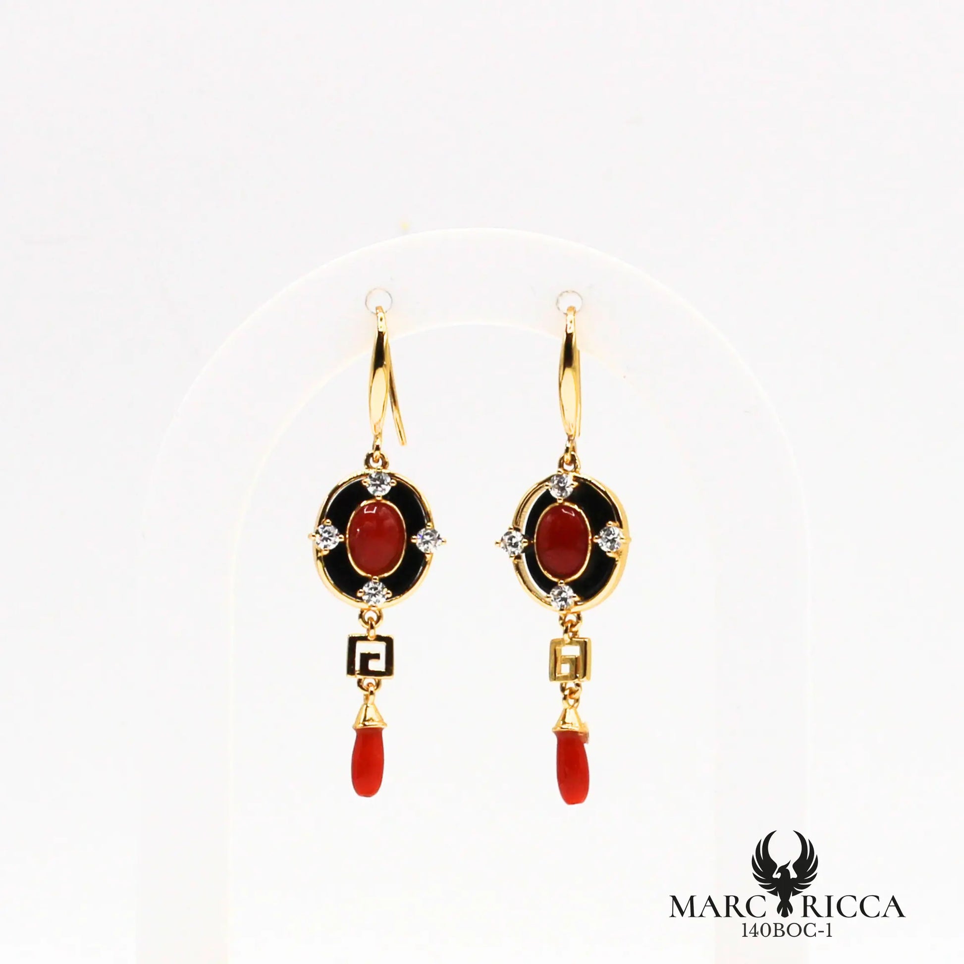 Boucles d'oreilles pendantes corail onyx et zirconium