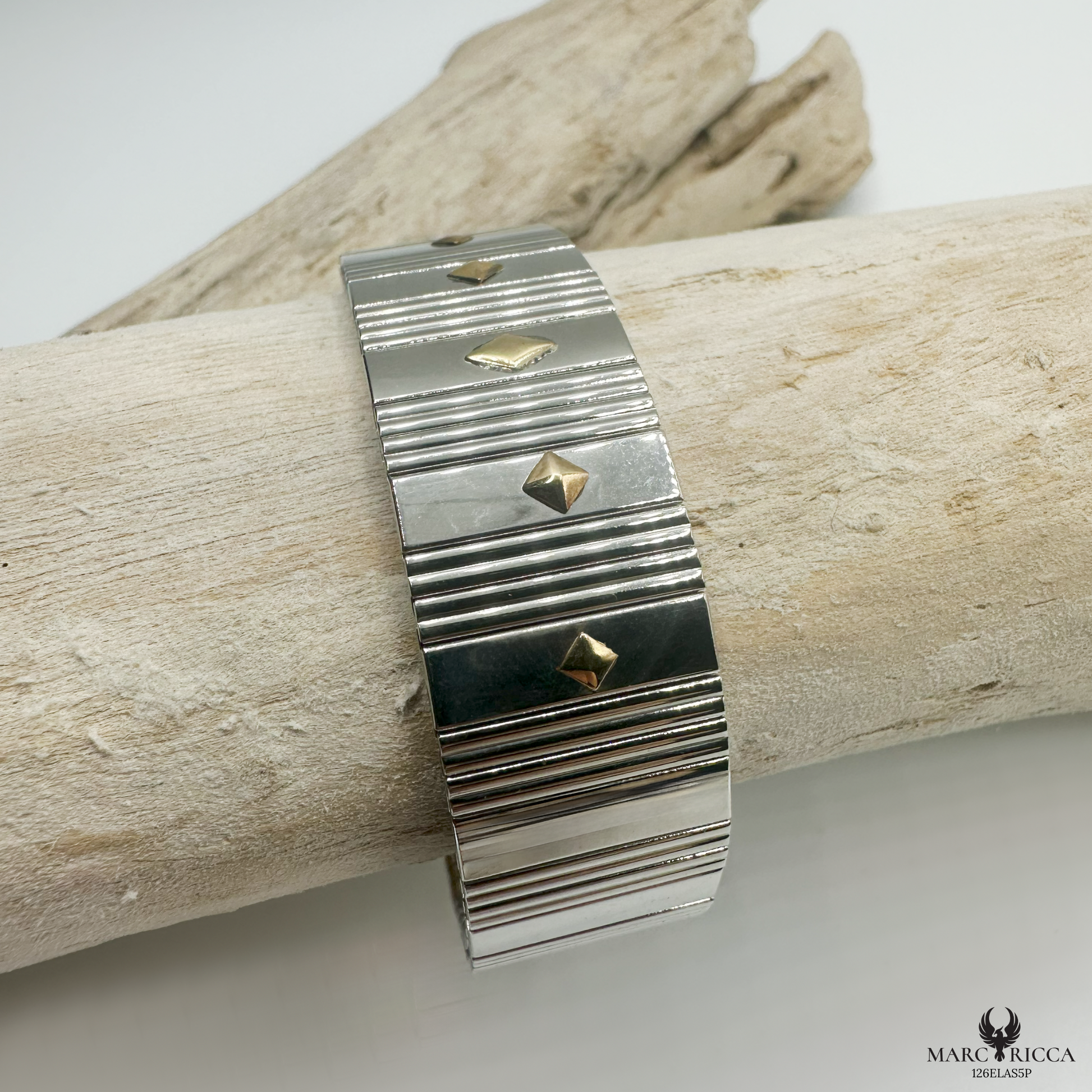 Ce bracelet en acier épais séduit par son design audacieux et intemporel, rehaussé de détails en or 18 carats qui lui confèrent une élégance luxueuse. Sa robustesse et son allure moderne en font un bijou parfait pour affirmer sa personnalité tout en restant sophistiqué. Idéal pour un style quotidien chic ou pour compléter une tenue habillée, ce bracelet allie durabilité et esthétique. Un accessoire incontournable pour une allure confiante et un raffinement discret.