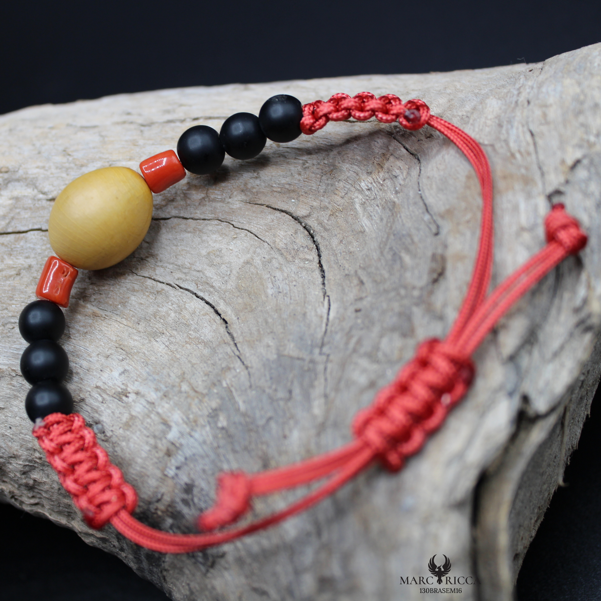 Ce bracelet raffiné allie une graine canique orangée éclatante, deux morceaux de corail rouge intense, et six perles en bakélite noire mate pour un design unique et sophistiqué. Monté sur un cordon au choix : noir, rouge ou gris, il s’adapte à votre style et vos envies. Parfait mélange de textures et de couleurs, ce bijou intemporel apporte une touche de caractère et d’élégance à toutes vos tenues.
