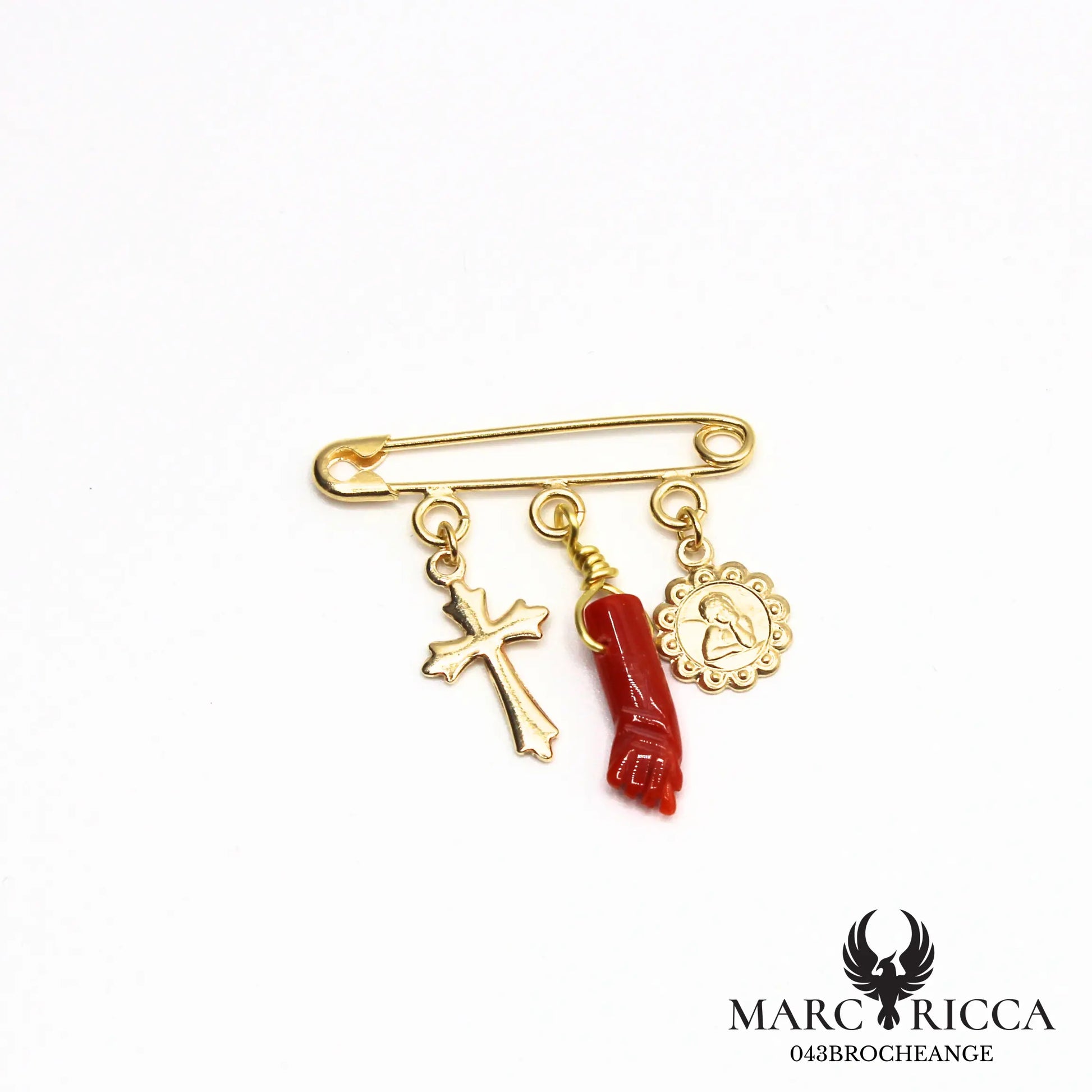 Symbolique et raffinée, cette broche en vermeil met en valeur une main en corail naturel, accompagnée d’une croix délicate et d’un petit ange protecteur. Chaque élément porte une forte signification, faisant de ce bijou un véritable porte-bonheur, empreint de spiritualité et de douceur.