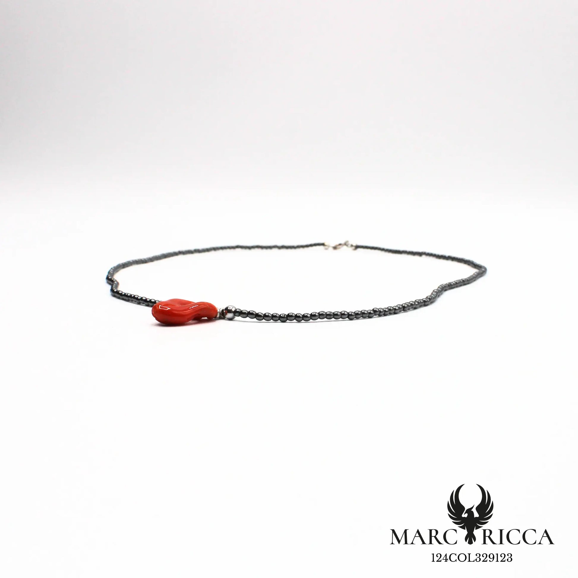 Un collier élégant et contemporain, composé de perles d’hématite au fini profond et métallique, mises en valeur par un anneau en corail placé au centre. Ce contraste entre la douceur du corail et l’éclat minéral de l’hématite crée un bijou à la fois moderne et raffiné.
