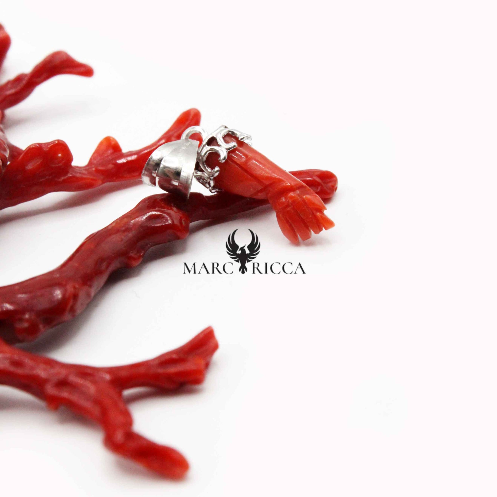 Doté d'un poing et corne sculptés dans du corail rouge de qualité, ce pendentif en or Blanc est un accessoire parfait pour votre style. Une pièce unique qui ajoute une note subtile et identitaire à votre tenue.