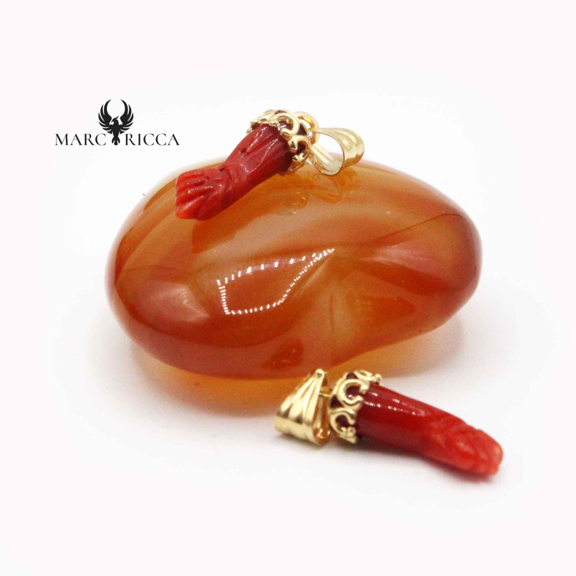 Doté d'un poing et corne sculptés dans du corail rouge de qualité, ce pendentif en or jaune est un accessoire parfait pour votre style. Une pièce unique qui ajoute une note subtile et identitaire à votre tenue.